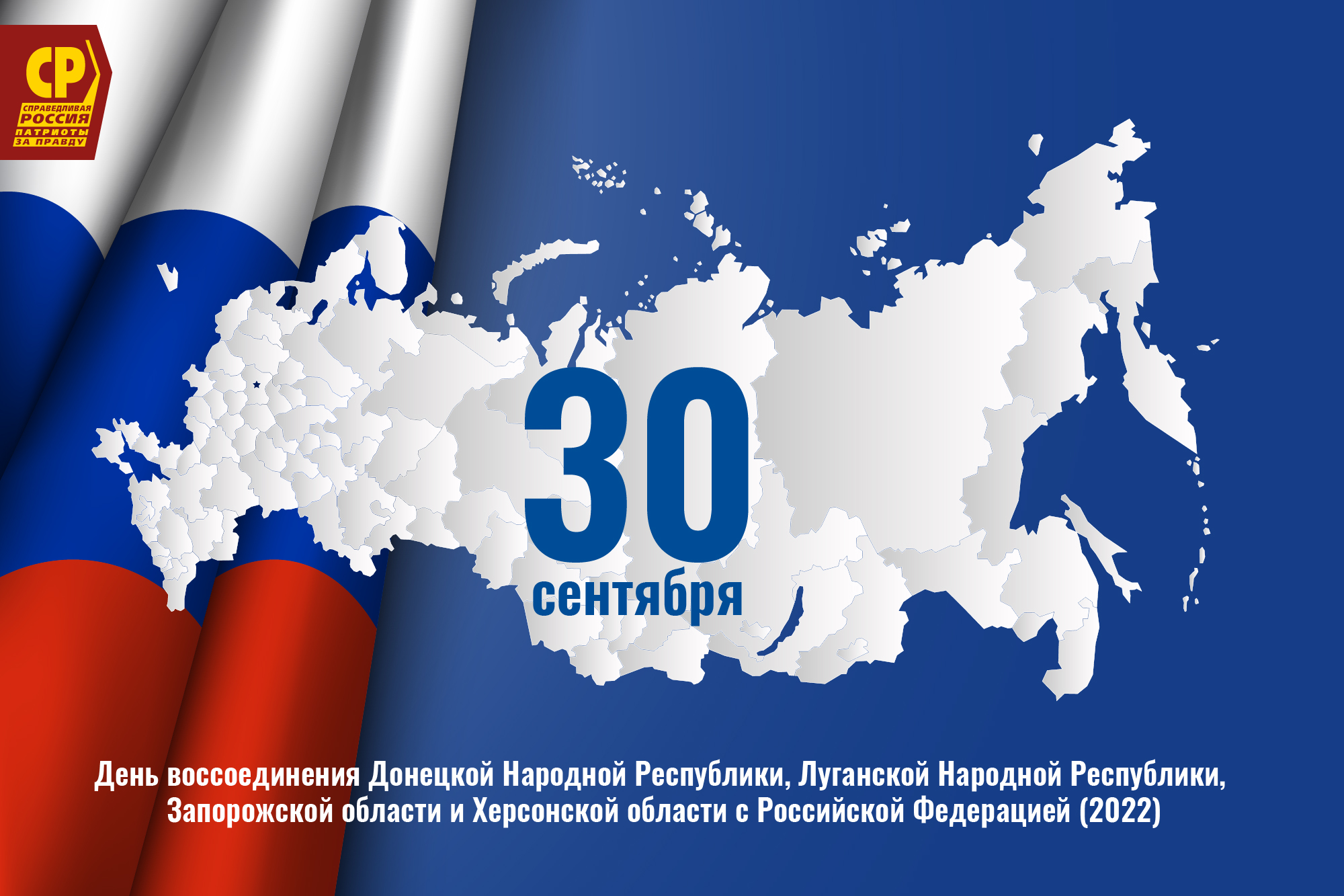 От имени Социалистической политической партии "СПРАВЕДЛИВАЯ РОССИЯ – ПАТРИОТЫ – ЗА ПРАВДУ" горячо и сердечно поздравляем вас с великим историческим событием – Днём воссоединения Донецкой и Луганской Народных Республик, Запорожской и Херсонской областей с Российской Федерацией!